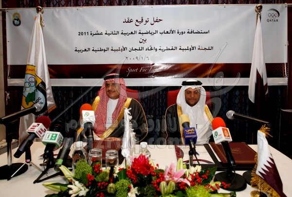 الامير سلطان بن فهد خلال توقيع اتفاقية استضافة دورة الالعاب الرياضية العربية في قطر بتاريخ 6 يناير 2009
