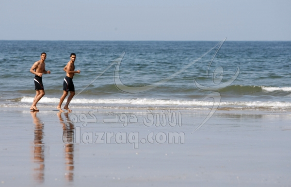 جولة لمدرب الكويت محمد ابراهيم وبعض اللاعبين على الشاطئ في فندق اللاعبين في مسقط بتاريخ 11 يناير 2009