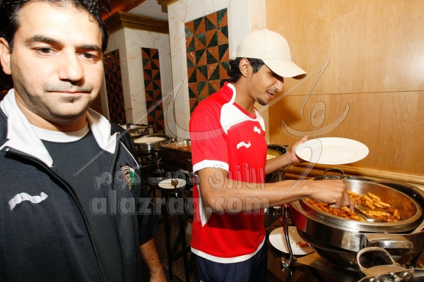 لاعبو منتخب الكويت خلال الغداء في فندق اللاعبين في مسقط بتاريخ 12 يناير 2009