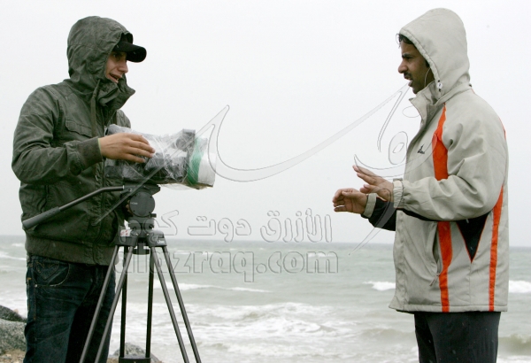 طاقم تصوير تلفزيون الوطن مبارك الدوسري والمصور محمود الحوساني خلال العاصفة الرعدية في مسقط بتاريخ 14 يناير 2009