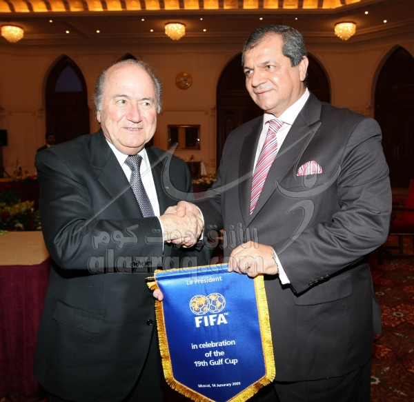اجتماع سيب بلاتر برؤساء الاتحادات الخليجية خلال خليجي 19 في مسقط بتاريخ 14 يناير 2009