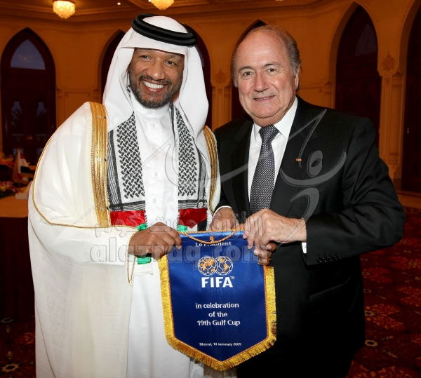 اجتماع سيب بلاتر برؤساء الاتحادات الخليجية خلال خليجي 19 في مسقط بتاريخ 14 يناير 2009