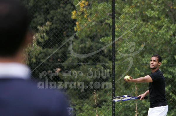 بدر المطوع وحسين فاضل بعد تمرين الصباح يمارسان التنس في فندق اللاعبين في كانبرا بإستراليا بتاريخ 2 مارس 2009