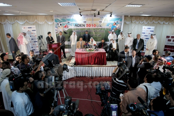 الشيخ أحمد الفهد خلال المؤتمر الصحفي في فندق ميركيور عدن خلال خليجي 20 بتاريخ 28 نوفمبر 2010